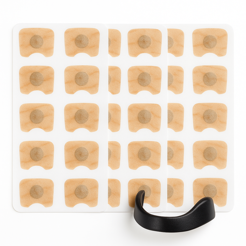 Incluye bandas reutilizables, pestañas desechables y un aplicador magnético para una colocación rápida y personalizada. Perfecto para el día a día, el gimnasio o tus rutinas de alto rendimiento.